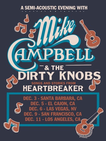 September 10, 2025—Celebrated guitarist and songwriter Mike Campbell (Tom Petty and The Heartbreakers, Fleetwood Mac) and his band The Dirty Knobs are returning to the road for a run of shows in select West Coast cities this December. Titled “A Semi-Acoustic Evening with Mike Campbell & The Dirty Knobs—Songs and Stories from Heartbreaker,” the performances will feature the Dirty Knobs lineup including longtime Heartbreakers drummer Steve Ferrone, bassist Lance Morrison (Don Henley) and guitarist Chris Holt (Eagles). The shows find Campbell bringing his recent New York Times Best Selling memoir Heartbreaker (out now on Grand Central Publishing) to life with an evening of songs and stories dating from Campbell’s early days with Tom Petty & The Heartbreakers all the way through his most recent album with The Dirty Knobs, the critically acclaimed Vagabonds, Virgins & Misfits (out now via BMG).