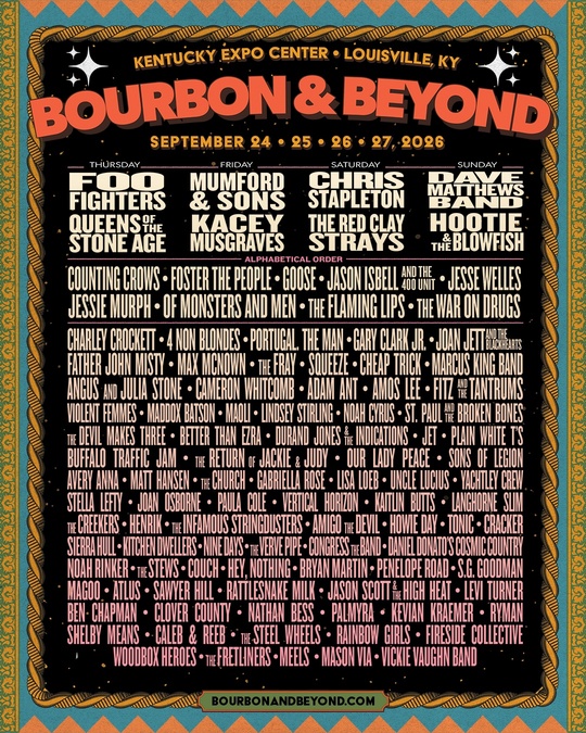 The complete music lineup for Bourbon & Beyond is as follows: Foo Fighters, Mumford & Sons, Chris Stapleton, Dave Matthews Band, Queens of the Stone Age, Kacey Musgraves, The Red Clay Strays, Hootie & the Blowfish, Counting Crows, Foster The People, Goose, Jason Isbell and the 400 Unit, Jesse Welles, Jessie Murph, Of Monsters and Men, The Flaming Lips, The War on Drugs, Charley Crockett, 4 Non Blondes, Portugal. The Man, Gary Clark Jr., Joan Jett & The Blackhearts, Father John Misty, Max McNown, The Fray, Squeeze, Cheap Trick, Marcus King Band, Angus and Julia Stone, Cameron Whitcomb, Adam Ant, Amos Lee, Fitz and the Tantrums, Violent Femmes, Maddox Batson, Maoli, Lindsey Stirling, Noah Cyrus, St. Paul & The Broken Bones, The Devil Makes Three, Better Than Ezra, Durand Jones & The Indications, Jet, Plain White T’s, Buffalo Traffic Jam, The Return of Jackie and Judy, Our Lady Peace, Sons of Legion, Avery Anna, Matt Hansen, The Church, Gabriella Rose, Lisa Loeb, Uncle Lucius, Yächtley Crëw, Stella Lefty, Joan Osborne, Paula Cole, Vertical Horizon, Kaitlin Butts, Langhorne Slim, The Creekers, Henrik, The Infamous Stringdusters, Amigo The Devil, Howie Day, Tonic, Cracker, Sierra Hull, Kitchen Dwellers, Nine Days, The Verve Pipe, Congress The Band, Daniel Donato’s Cosmic Country, Noah Rinker, The Stews, Couch, hey, nothing, Bryan Martin, Penelope Road, S.G. Goodman, Magoo, Atlus, Sawyer Hill, Rattlesnake Milk, Jason Scott & The High Heat, Levi Turner, Ben Chapman, Clover County, Nathan Bess, Palmyra, Kevian Kraemer, Ryman, Shelby Means, Caleb & Reeb, The Steel Wheels, Rainbow Girls, Fireside Collective, Woodbox Heroes, The Fretliners, Meels, Mason Via and Vickie Vaughn Band.